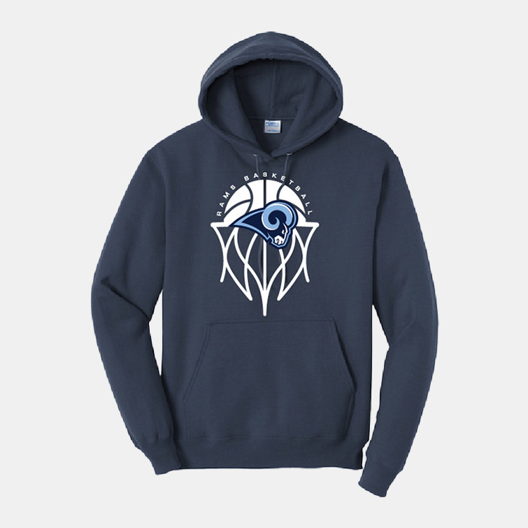 Port & Co™ brand hoodie for Rams Basketball, with a logo on the front.