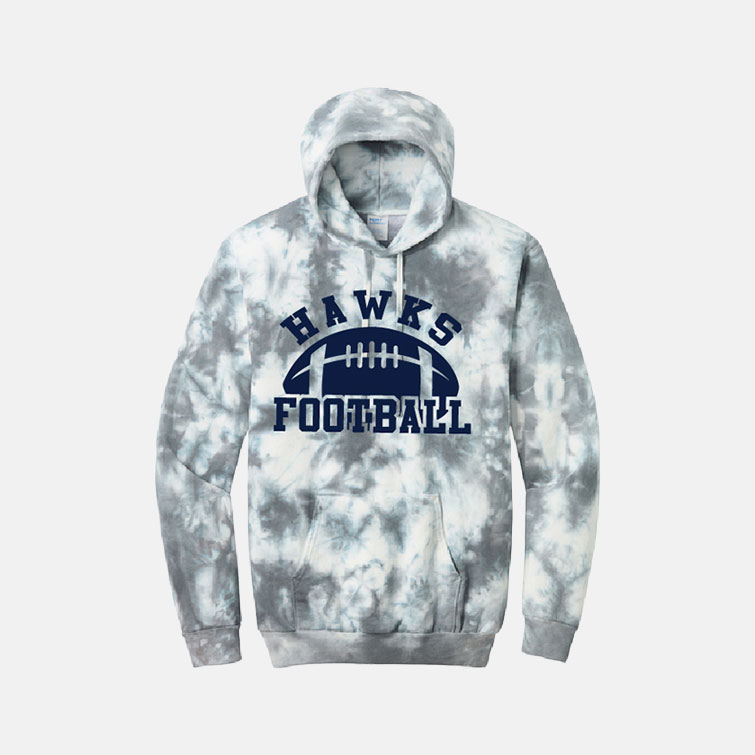 Port & Co™ brand tie dye hoodie for the TCYFL Hawks Football program, with a logo on the front.