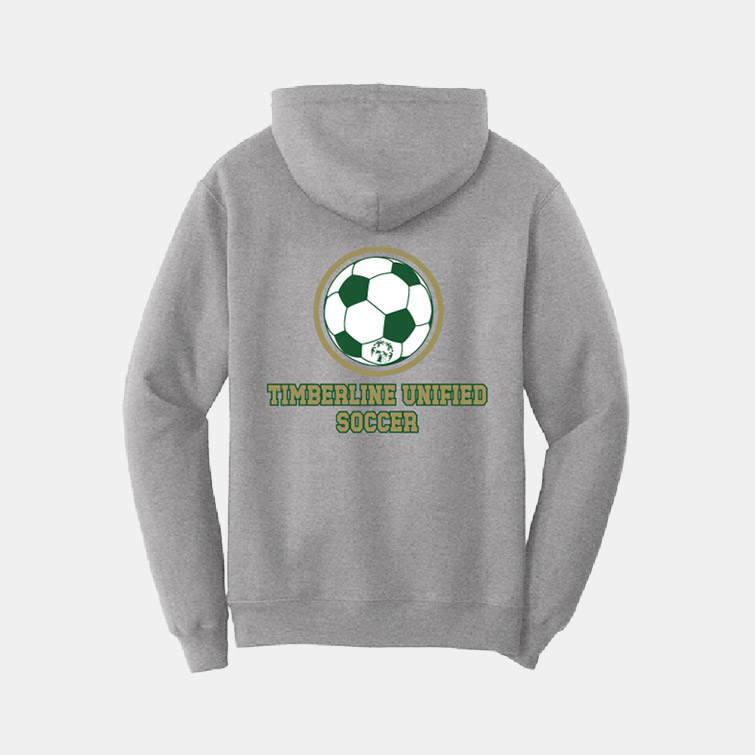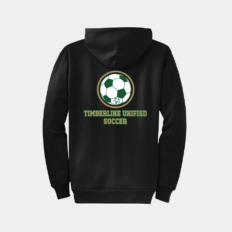 Port & Co™ brand full zip hoodie for the Timberline Unified Soccer program, with a logo on the front and the back.